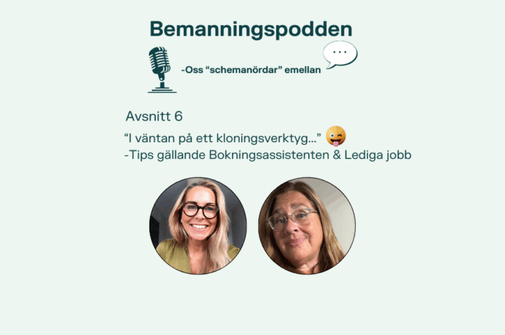 Som en naturlig fortsättning på avsnitt 5 hör vi här Jenny och Jessica Widerberg samtala kring det som alltid händer så fort schemat är klart och olika frånvaroavvikelser inträffar. Vad finns det för vinster med att se över användandet av Bokningsassistenten och Lediga Jobb? Finns det automatiseringar som ligger oanvända pga ett ouppdaterat arbetssätt eller inaktuell process?